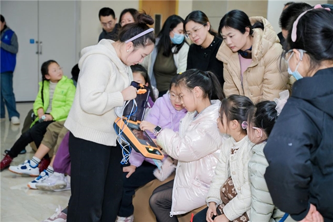在医师的悉心指导下,孩子们迅速进入状态。他们按照正确的步骤和姿势,双手交叠,有节奏地对模拟人进行心肺复苏按压,每一次按压都饱含着对生命的敬畏;接着,又小心翼翼地进行人工呼吸,仿佛在为生命注入新的希望。随后,孩子们又投入到除颤仪操作练习中,学习如何精准地使用除颤仪进行电击除颤。