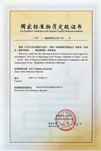 今年7月,国家市场监管总局决定在内蒙古自治区等四省市开展二级标准物质行政审批改革试点,旨在优化流程、激发创新活力,强化计量对产业高质量发展的支撑保障作用。作为自治区乳业龙头,伊利股份积极响应,依托长期积累的科研实力与计量技术基础,率先完成了相关标准物质的研制与申报工作,并成功通过评审,成为全区首家获证企业。